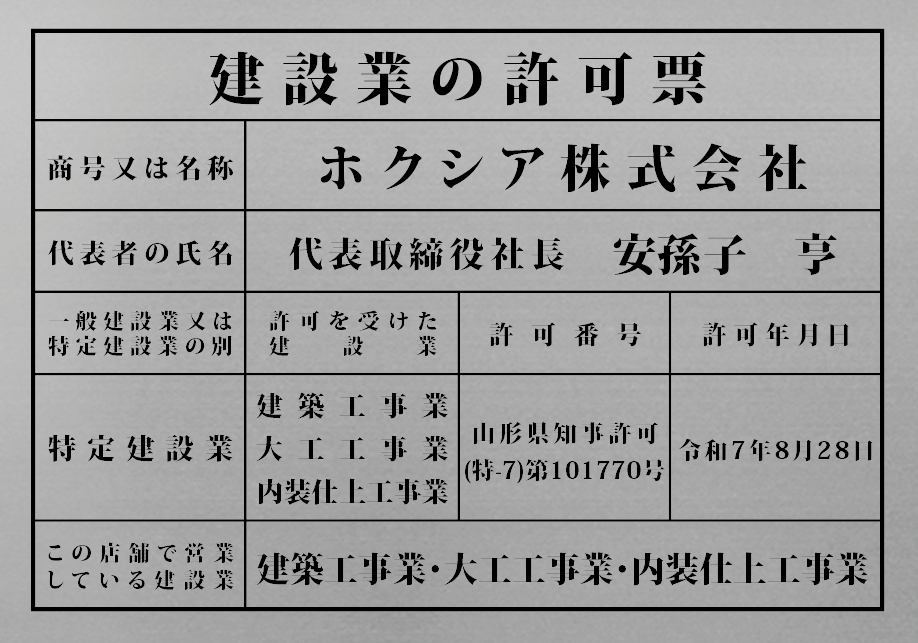 この度、ホクシア株式会社は、令和7年8月28日付で山形県知事より特定建設業の許可を取得いたしました。